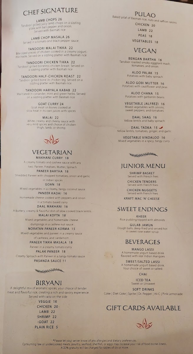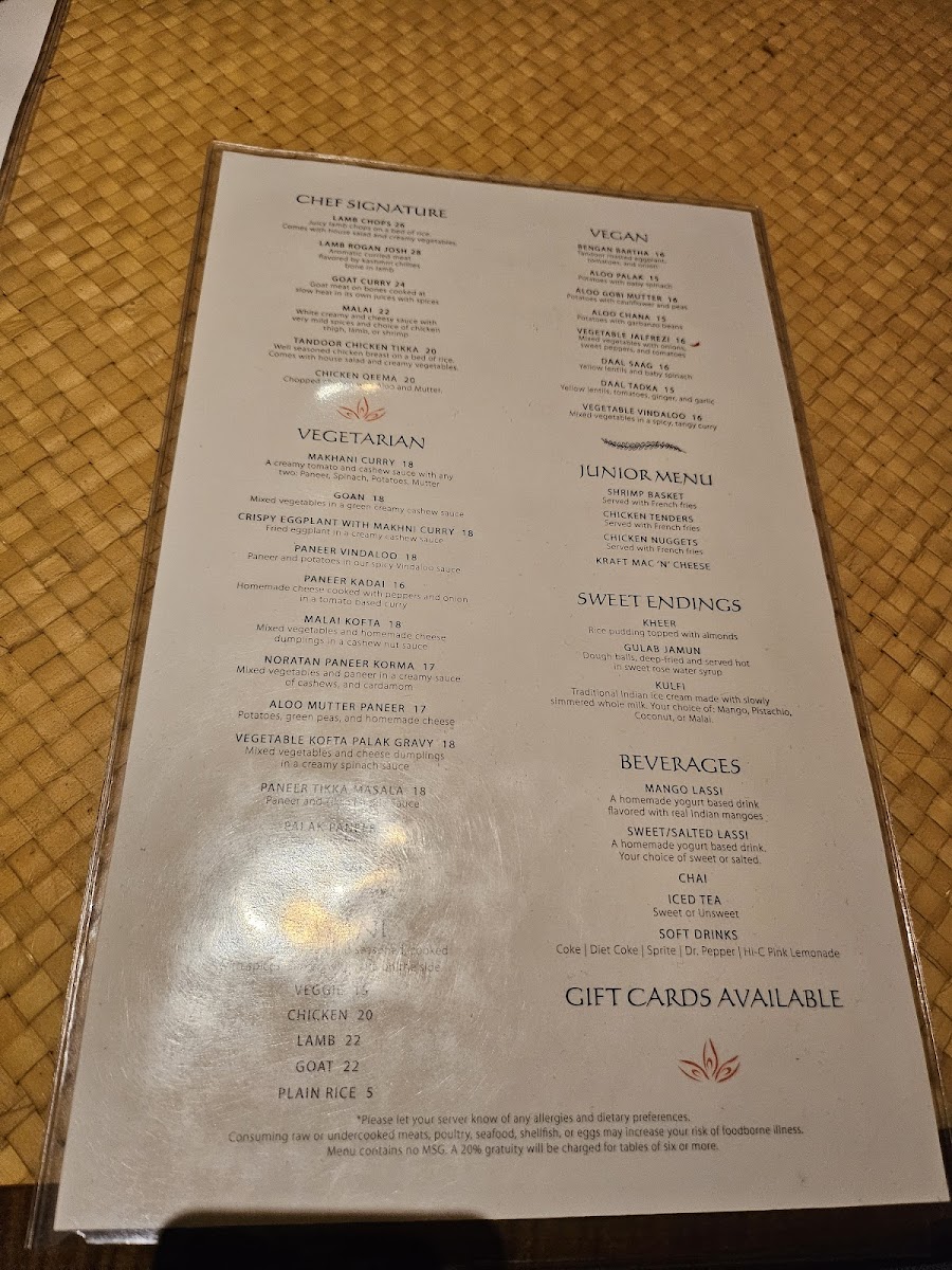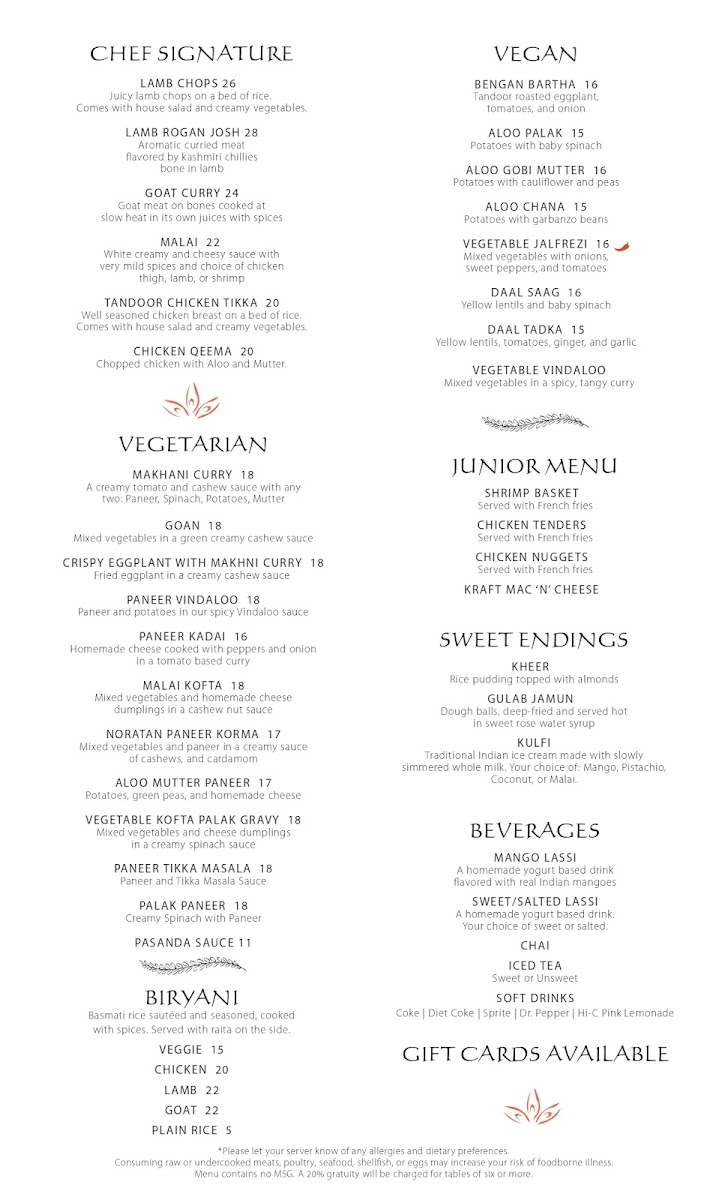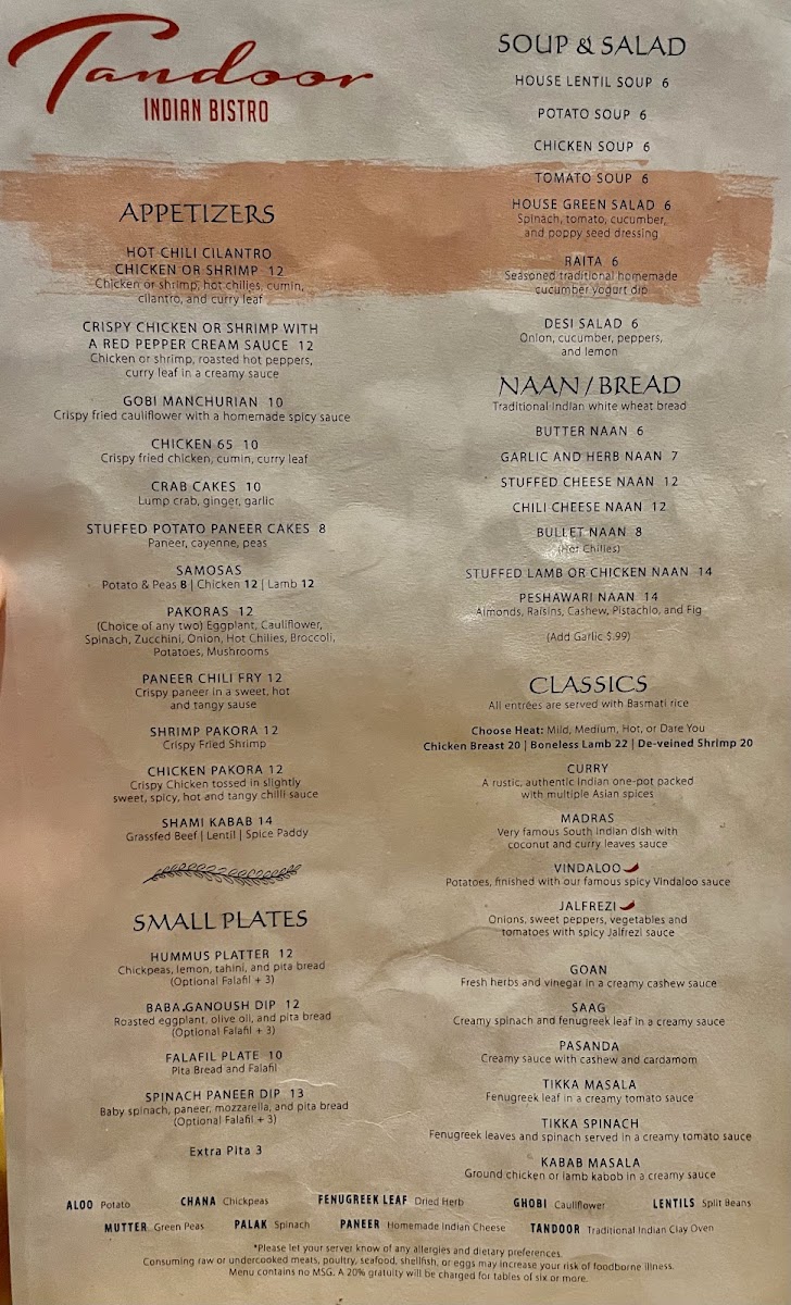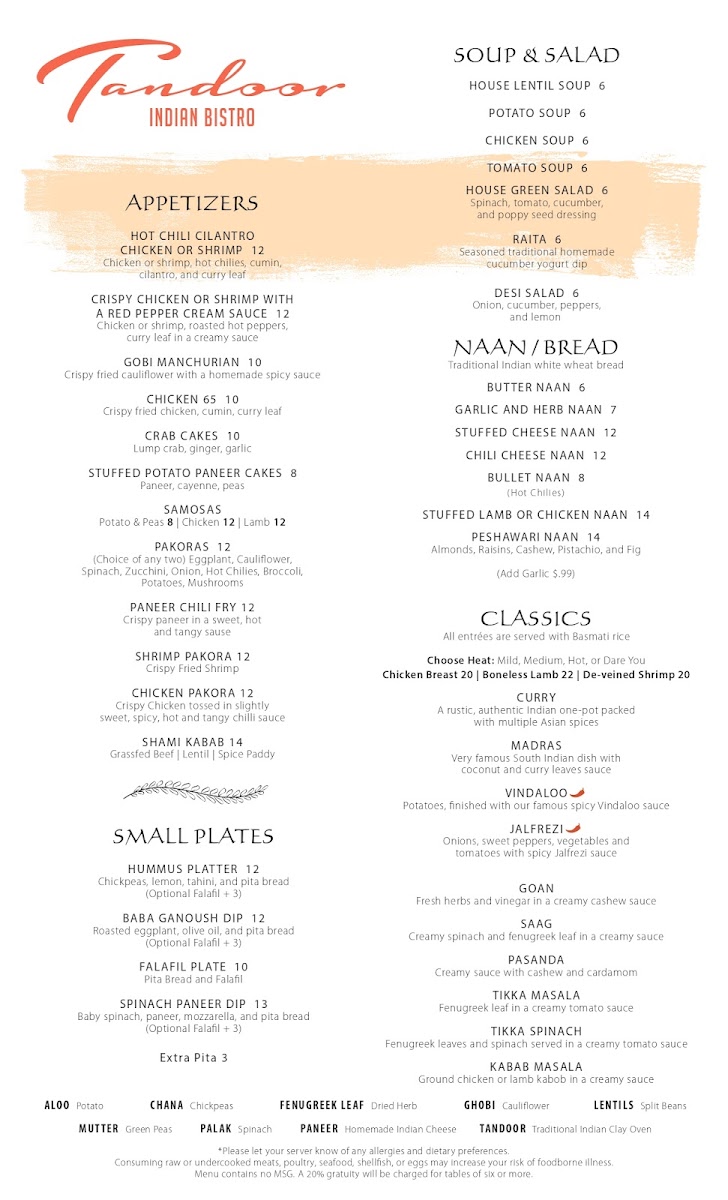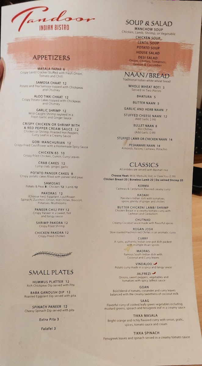 At Tandoor Indian Bistro, we invite you to indulge in the rich and vibrant flavors of India. The menu features a tantalizing variety of traditional and contemporary dishes, each crafted with the freshest ingredients and authentic spices. From savory curries to perfectly grilled meats, every bite is designed to transport you straight to the heart of India. Whether you're in the mood for a hearty chicken tikka masala, a flavorful vegetarian saag paneer, or something new to try, Tandoor Indian Bistro Menu offers something for every taste. The comforting aromas of freshly baked naan and fragrant basmati rice accompany every dish, making it a perfect meal for any occasion. If you’re looking for a true taste of India, this is the place to be!